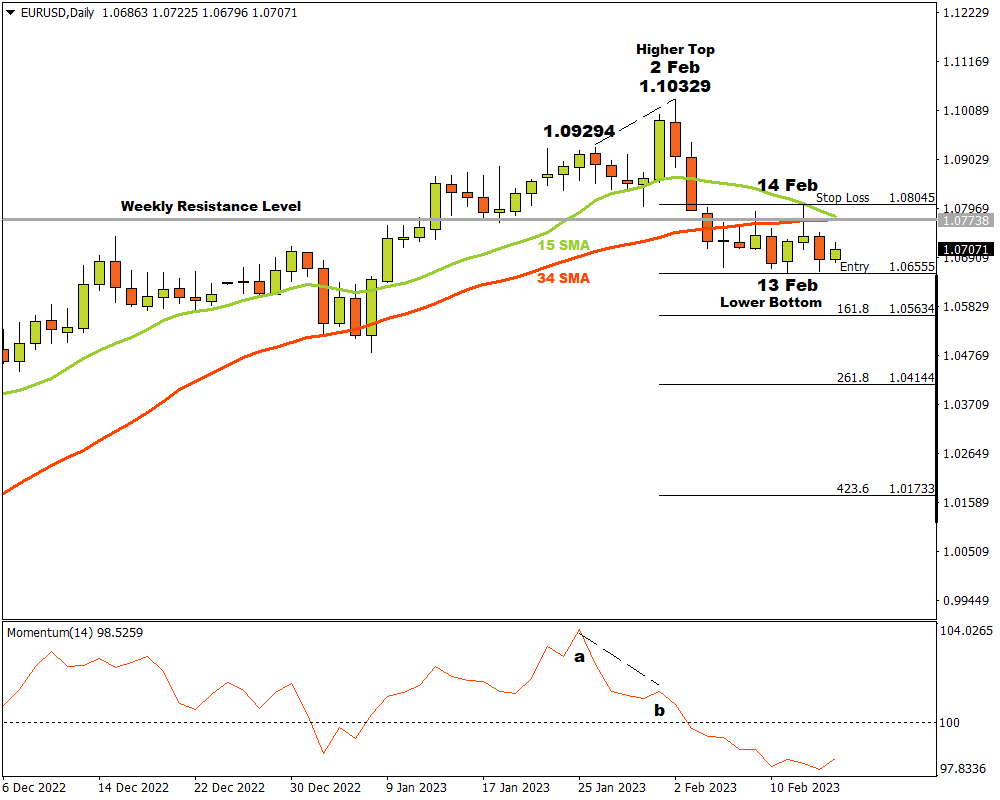 A closer look at the Momentum Oscillator reveals negative divergence between point “a” and “b” when comparing the tops at 1.09294 and 1.10329. This should have alerted technical traders that the bullish momentum could be fading.
