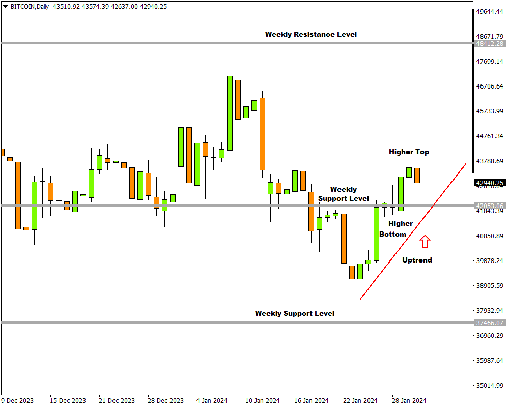 Bitcoin kicked of the week charging through a significant resistance level at 42053.06, signalling the start of a potential uptrend on the daily timeframe.