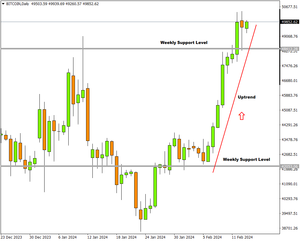Prices are firmly bullish on the daily charts with the higher highs and higher lows confirming an uptrend. The upside momentum not only propelled prices towards a weekly resistance level but also triggered a breakout – opening a path beyond the psychological $50,000 level.