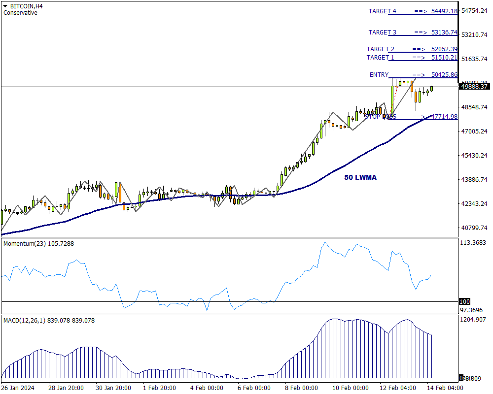 On the 4-hour chart, a strong uptrend is in progress. The price is above the 50 Linear Weighted Moving Average with both the Momentum Oscillators as well as the longer price cycle Moving Average Convergence Divergence (MACD) Oscillators confirming the upward momentum.