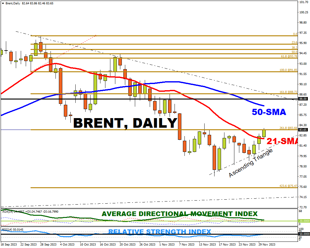 Since the November 16th low at $77.08, the black gold has rallied within an ascending triangle for over 600 points and as of the time of writing sits above its 21-day SMA at around $83.