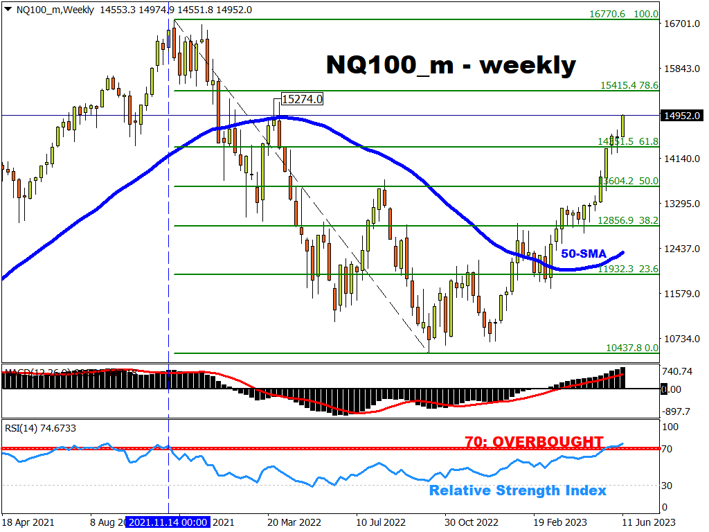 - The NQ100_m (which reflects the underlying Nasdaq 100 index) may then be pushed well above the psychologically-important 15,000 mark, and closer to the March 2022 peak of 15,274.
