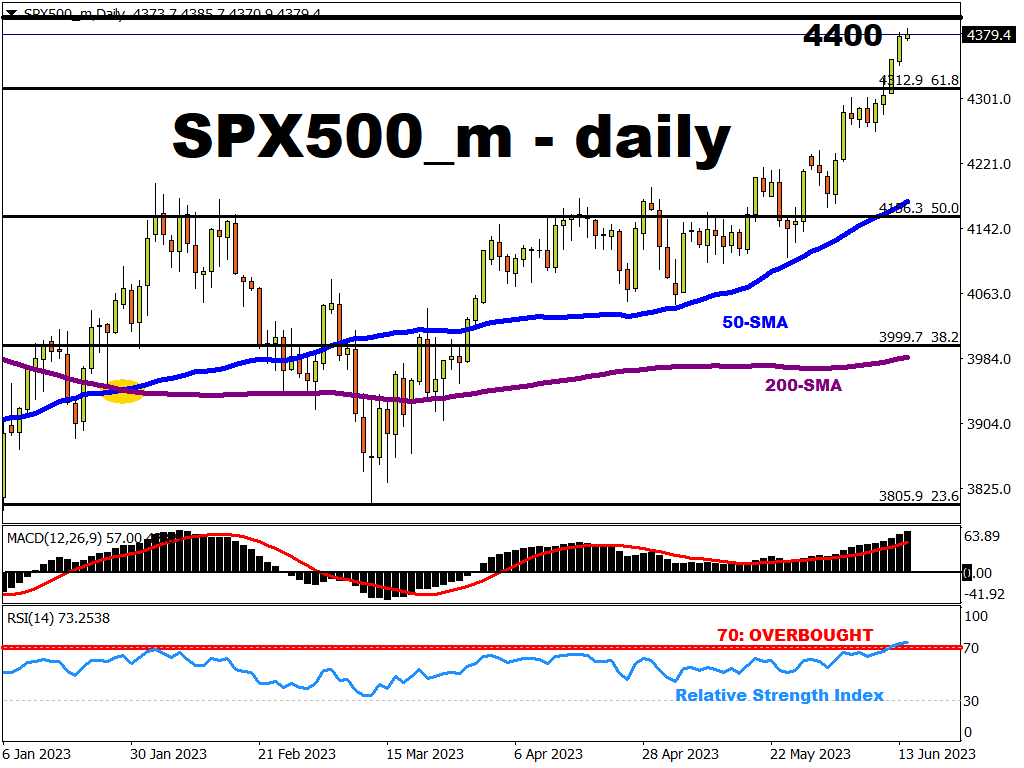 - The SPX500_m (which reflects the underlying S&P 500 index) may then be pushed past the psychologically-important 4,400 mark.