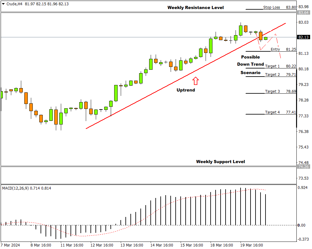 On the 4-hour chart, an extended uptrend can be seen with a correction wave in progress. The price is close to the weekly resistance level and the manual trendline has been broken. The longer price cycle Moving Average Convergence Divergence (MACD) Oscillators is still bullish, but the signal line has been broken and this might hint at a possible overbought scenario. A market that is in an overbought state may well slow down and then a possible reversal can be on the books.