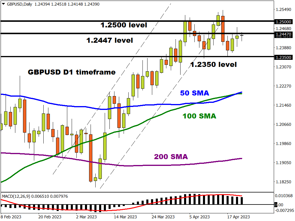 The dollar recovery which began late last week follows a jump in US inflation expectations data. CPI figures around the globe, including yesterday’s hot UK numbers, have added to the theme that core inflation will stick around at higher levels for potentially longer than many market watchers believe. For the US, the all-important bond markets are seeing bets on interest rate cuts being priced out. The Fed funds rate is now seen at 4.6% by year-end, which is the highest since the banking turmoil began. This implies money markets are pricing in only two full cuts from the Fed’s peak by then. We note that there is only roughly a 20% chance of another 25bp rate hike beyond the FOMC’s May meeting.
