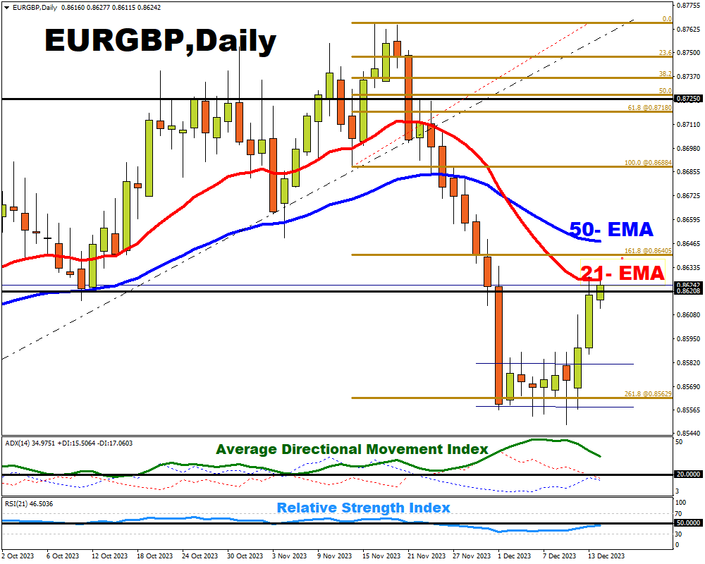 After struggling for direction over the last few days, the currency pair seems to be gaining momentum following the Fed decision overnight. Interest rates were left unchanged as widely expected but the key takeaway was the Fed signaling that it could start cutting rates next year in the face of cooling inflation. Traders are now pricing in a 25-basis point rate cut by March 2024!