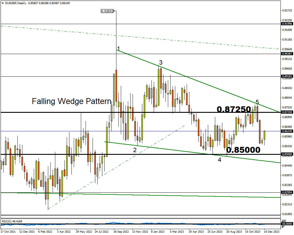 EURGBP is posting a falling wedge on the weekly time frame. This wedge has been in formation since November 4th, 2022.