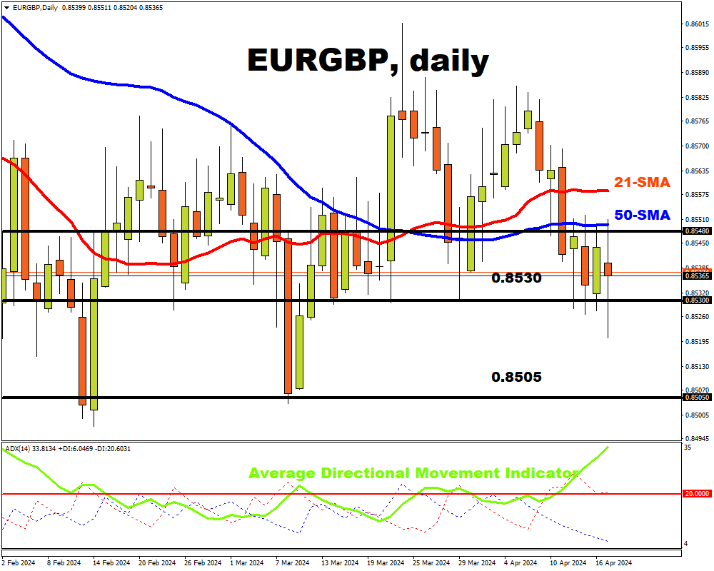 The Average Directional Movement Index (ADX), an indicator that shows the strength of the current market trend signals further downside for the EURGBP.