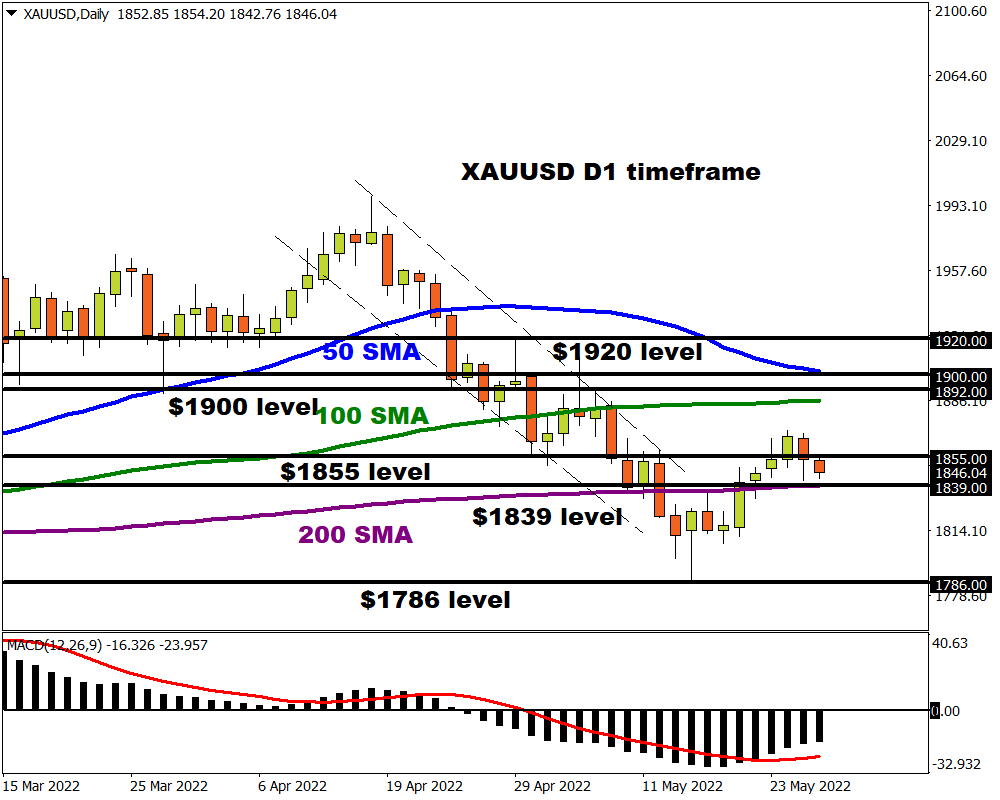Technically, the downtrend from the April high at $1998 remains intact for now. The recent pullback from the low at $1786 has taken us back to $1868 resistance. This is the 38.2% Fib retracement of the recent 210-dollar correction in April-May. The 200-day SMA is $1839, while above lies the 100-day SMA at $1886 and the 50% retrace at $1892.