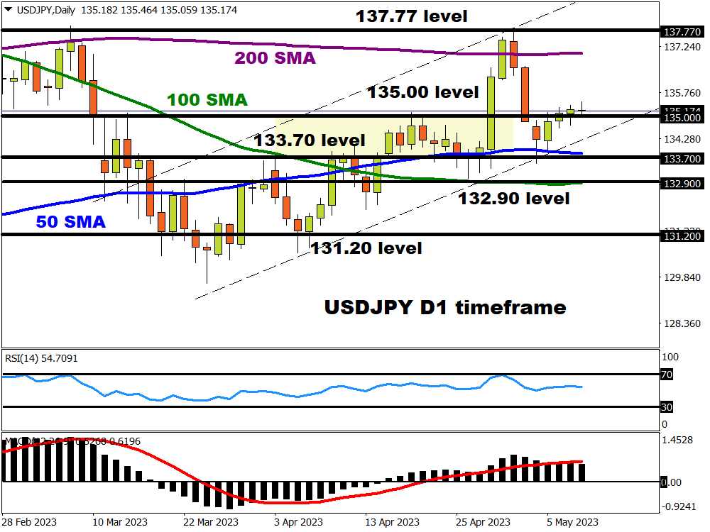 Despite breaking above the 135.00 resistance level, the USDJPY looks pressured on the daily charts. More resistance can be found around 137.00, where the 200-day SMA resides, and 137.77. If prices end up slipping back under 135.00, the USDJPY could test 133.70, 132.90, and 131.20.