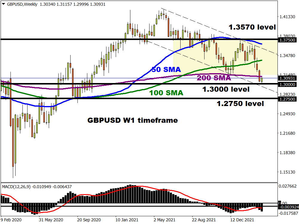 Pound bears remain in control on the weekly charts with prices respecting a bearish channel. The currency could experience a technical rebound from the 1.3000 support level before resuming the current downtrend. Bulls also need to overcome the 200-week Simple Moving Average which can be found around 1.3120. Fundamental factors in the form of the Fed & BoE policy meeting could play a role in where the currency pair concludes this week. Should 1.3000 prove to be unreliable support, a decline back towards 1.2750 could be on the cards.