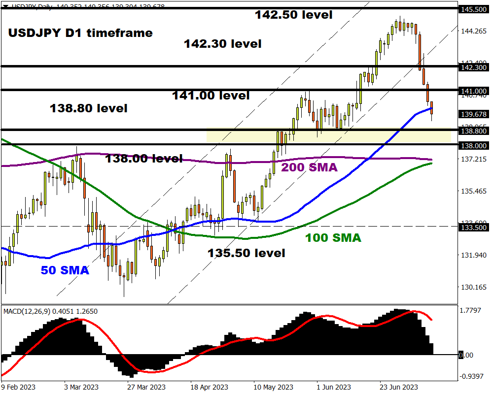 A weaker dollar has sent the USDJPY tumbling toward the 138.80 support level. A breakdown below this point could see a further selloff towards 138.00 and the 200-day SMA around 137.10. Should prices rebound from 138.80, we could see 141.00 and higher.