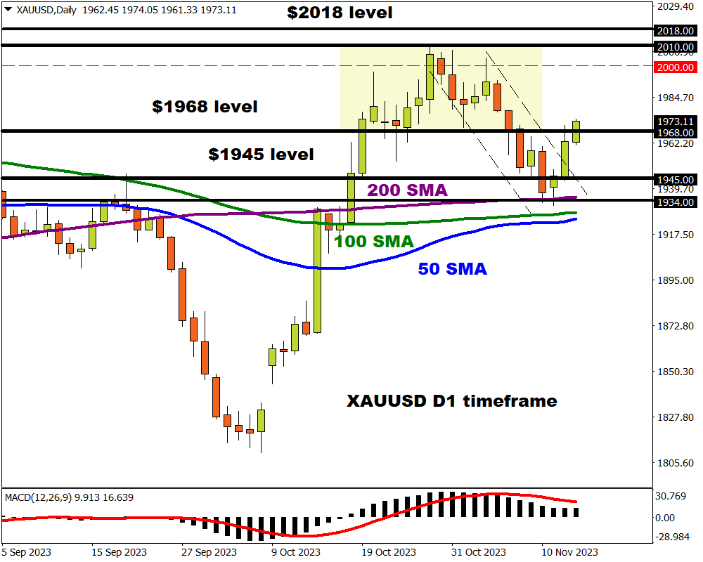 Focusing on the technical picture, gold could push higher if a daily close above $1968 is achieved.