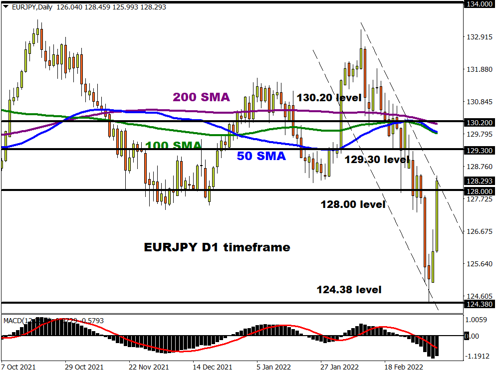 The EURJPY has jumped over 200 pips today thanks to a weakening Japanese Yen. Prices could turn bullish on the daily charts if a strong daily close above 129.30 is achieved. A selloff back below 128.00 may trigger a steep decline towards 124.38.