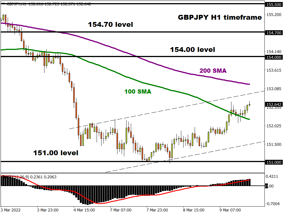 Things are looking bullish for the GBPJPY on the hourly charts. The upside momentum could take prices to 153.30 and 154.00 before bears re-enter the scene. A move below 152.20 could trigger a selloff towards 151.00.