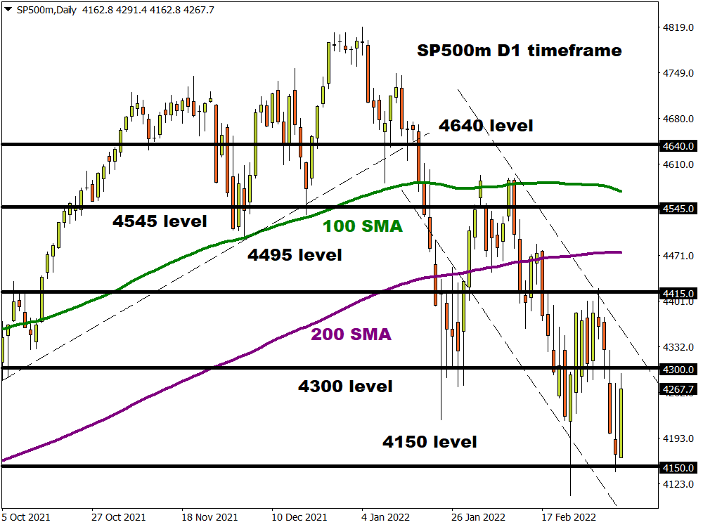 Despite today’s sharp rebound, the S&P500 remains in a bearish channel on the daily charts. If 4300 proves to be reliable resistance, a decline back towards 4150 and lower could become reality. Above 4300, the next key levels of interest can be found at 4415 and 4470 – a level just below the 200-day Simple Moving Average.