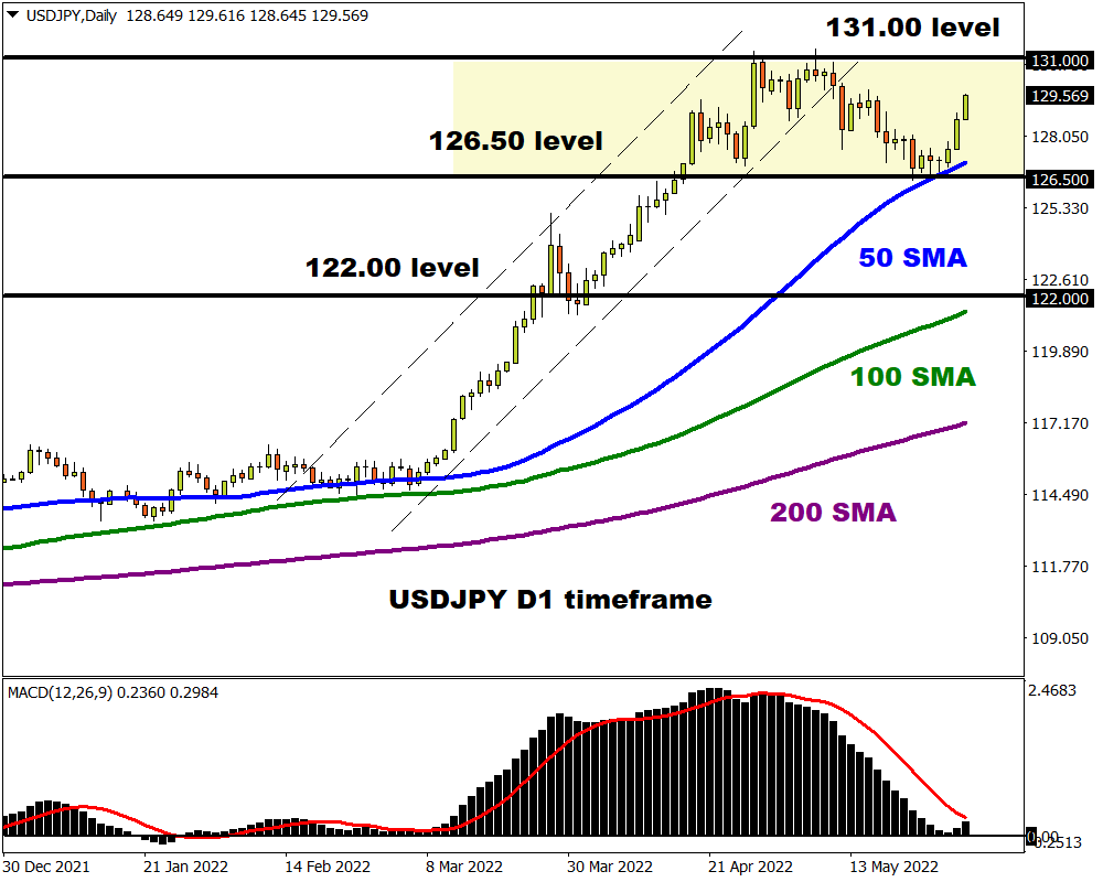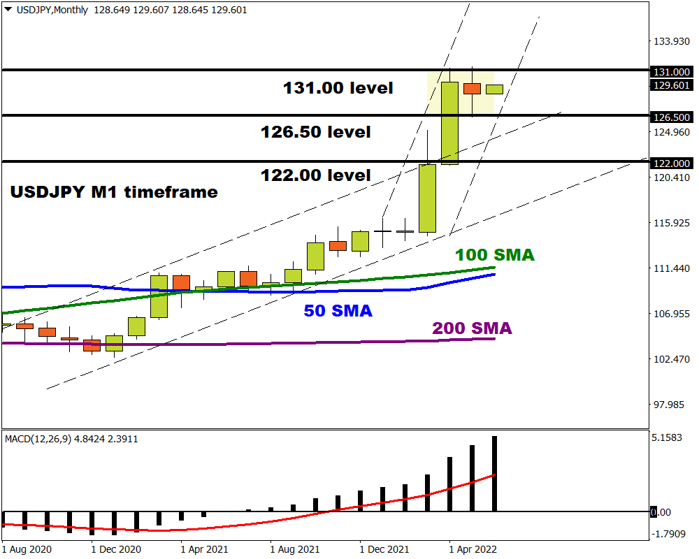 After rebounding from the 126.50 region, the USDJPY could be heading for fresh multi-decade highs beyond 131.00. Prices remain in a bullish trend on the monthly timeframe as there have been consistently higher highs and higher lows. The first key point of interest is at 131.00.