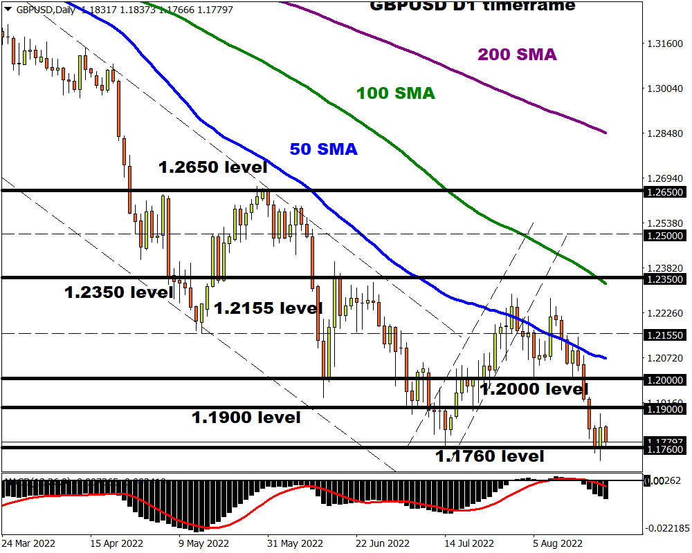 Bears remain in the driving seat with prices wobbling above 1.1760 as of writing. The GBPUSD is under pressure on the daily charts with a break below 1.1760 opening the doors to 1.1700 and 1.1600. A move back above 1.1900 is seen triggering a move higher towards 1.2000.