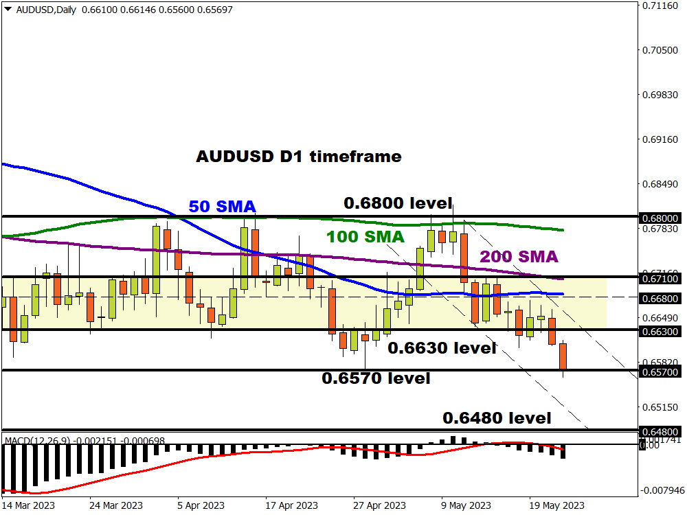 The AUDUSD has smashed into the 0.6570 support level. A breakdown below this point may see 0.6480. If bulls are able to defend 0.6570, prices could rebound toward 0.6630.
