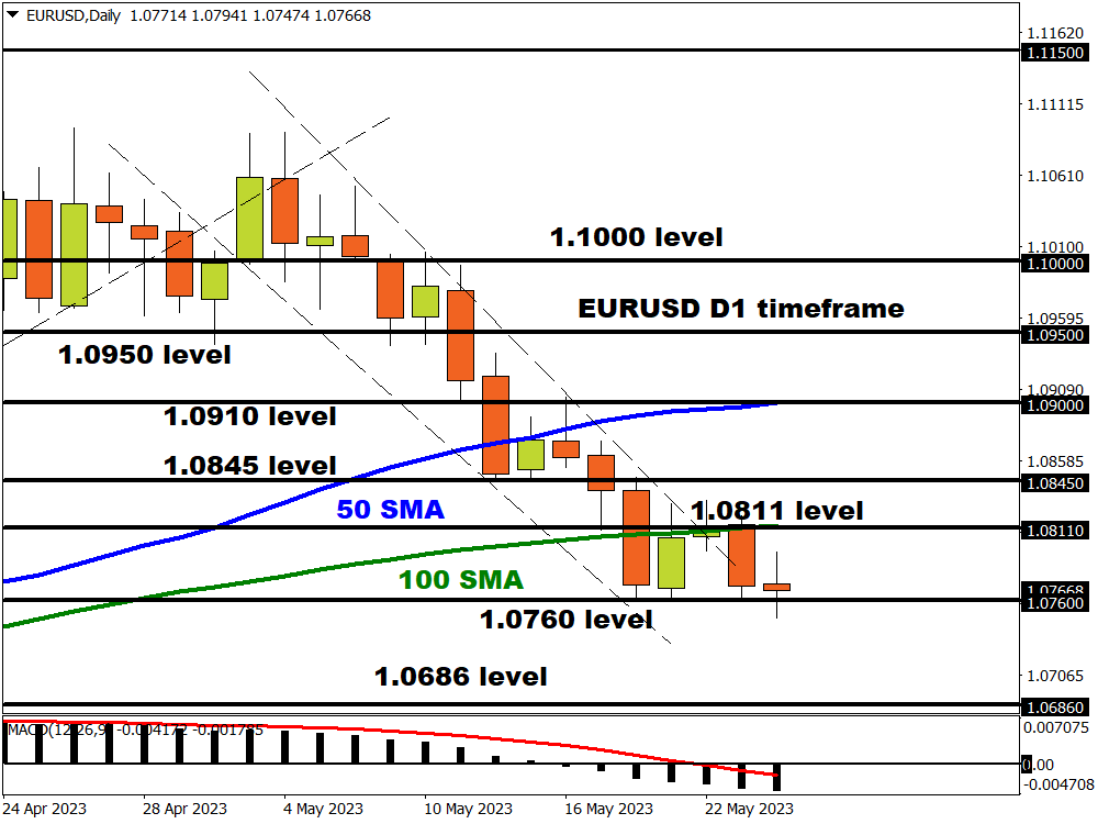 The EURUSD remains bearish on the daily charts with bears grinding down the 1.0760 support level. A solid daily close below this point could signal a decline toward 1.0686. Should bulls push back above 1.8110 – where the 100-day SMA resides, this could open a path back toward 1.0845 and 50-day SMA at 1.0900.