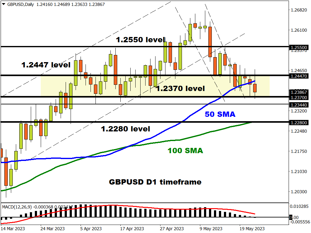 Sterling seems to be under pressure despite the UK inflation figures printing higher than expected. A solid breakdown below the 1.2370 level could open a path toward 1.2280. Should 1.2370 prove to be reliable support, prices may rebound back toward 1.2550.