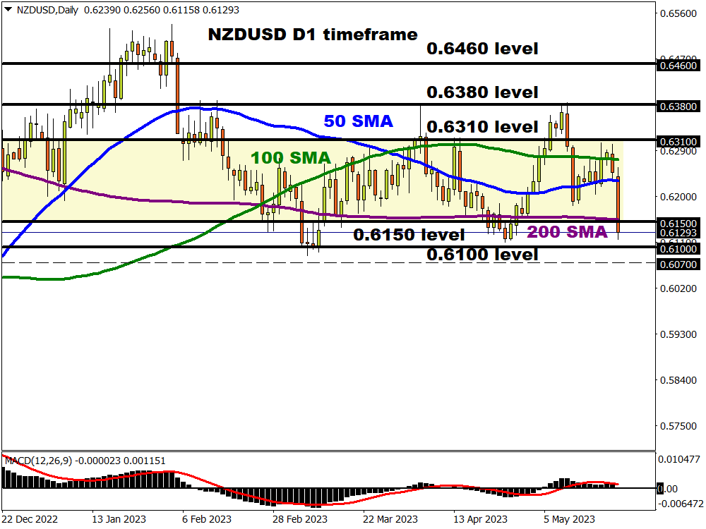 Our trade of the week (NZDUSD), tumbled this morning after the Reserve Bank of New Zealand hiked rates by 25 basis points and signalled that it could be done with rate hikes. Prices are trading below the 200-day SMA as of writing and could hit 0.6100 in the short term. Below this level may see the NZDUSD hit levels not seen since November 2022 around 0.6070.