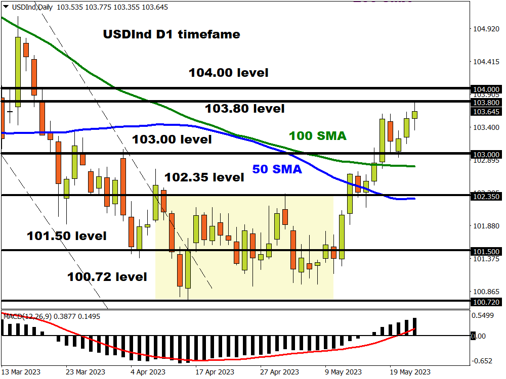 The dollar has been trading a little firmer despite the impasse in US debt-ceiling negotiations. Bulls seem to be drawing strength from hawkish Fed speakers and technical forces. Prices have turned bullish on the daily charts with support found at 103.00. The upside momentum has already taken prices towards 103.80 with 104.00 the next key level of interest.