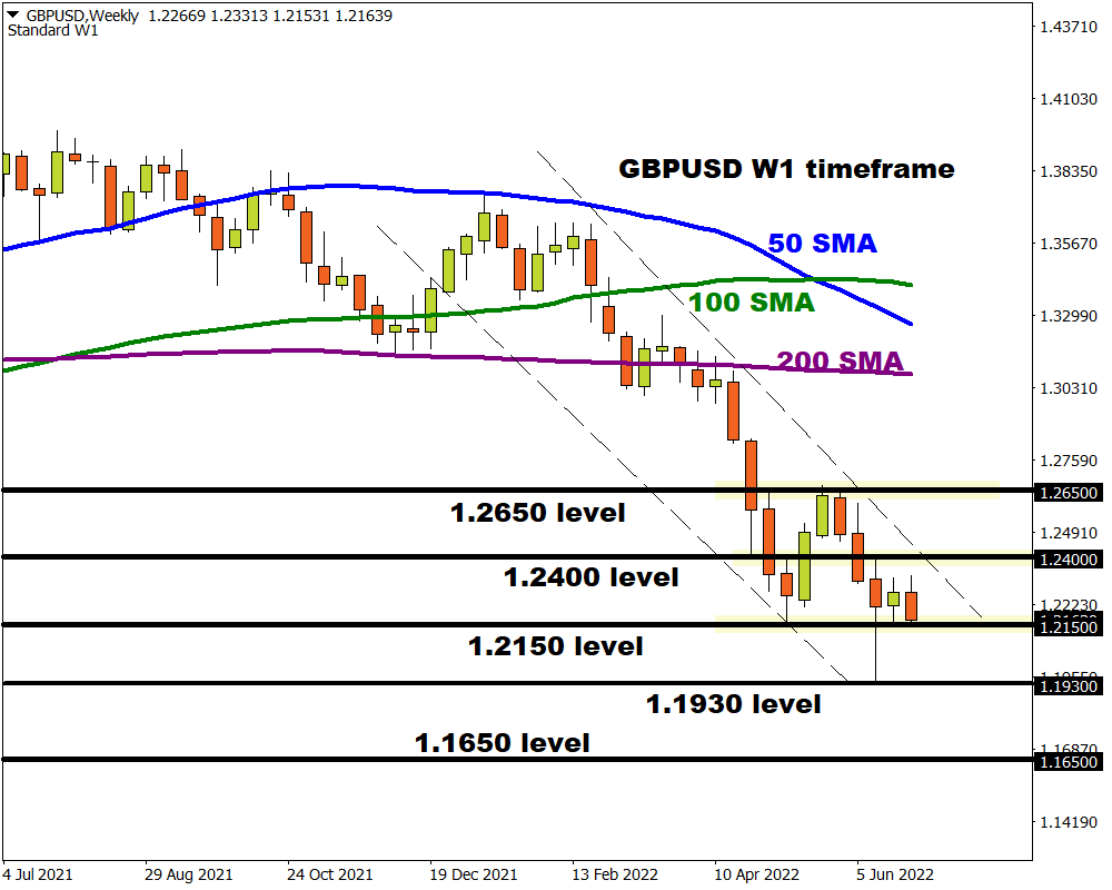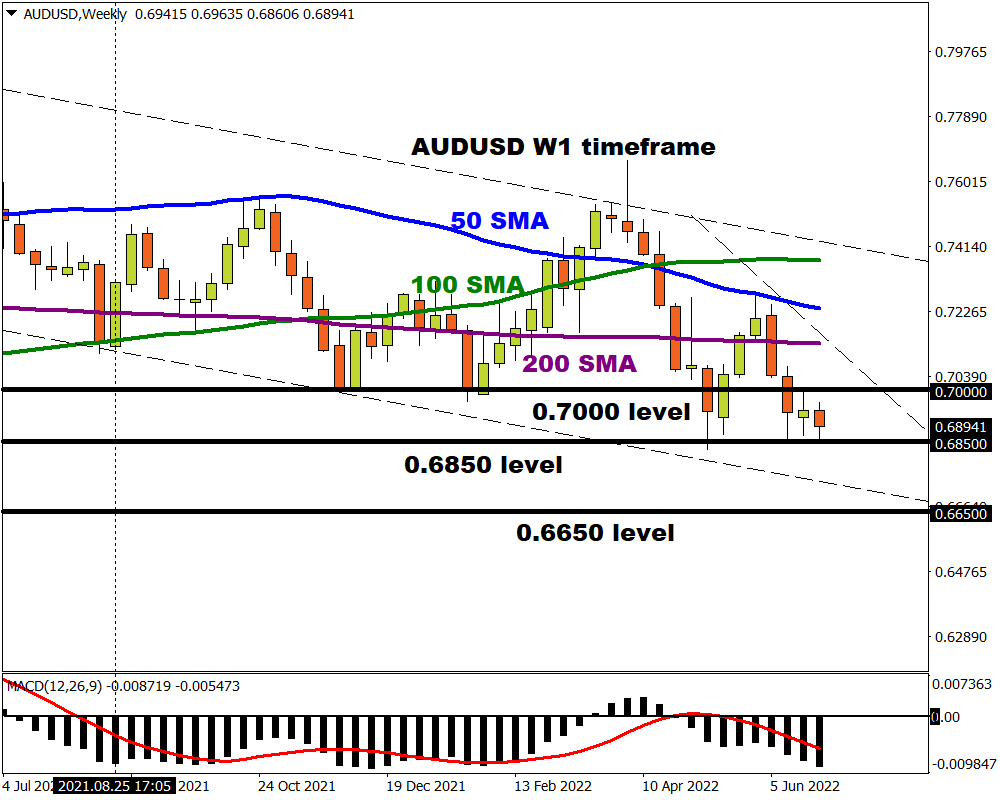 The AUDUSD weekly chart says it all. Prices are under pressure and trading below the 50,100- and 200-week Simple Moving Averages. Support can be found at 0.6850 while resistance can be seen at 0.7000. A strong weekly close below the 0.6850 support could trigger a selloff to 0.6650. If prices manage to push back above 0.7000, then the next resistance will be at the 200-week SMA at 0.7130.