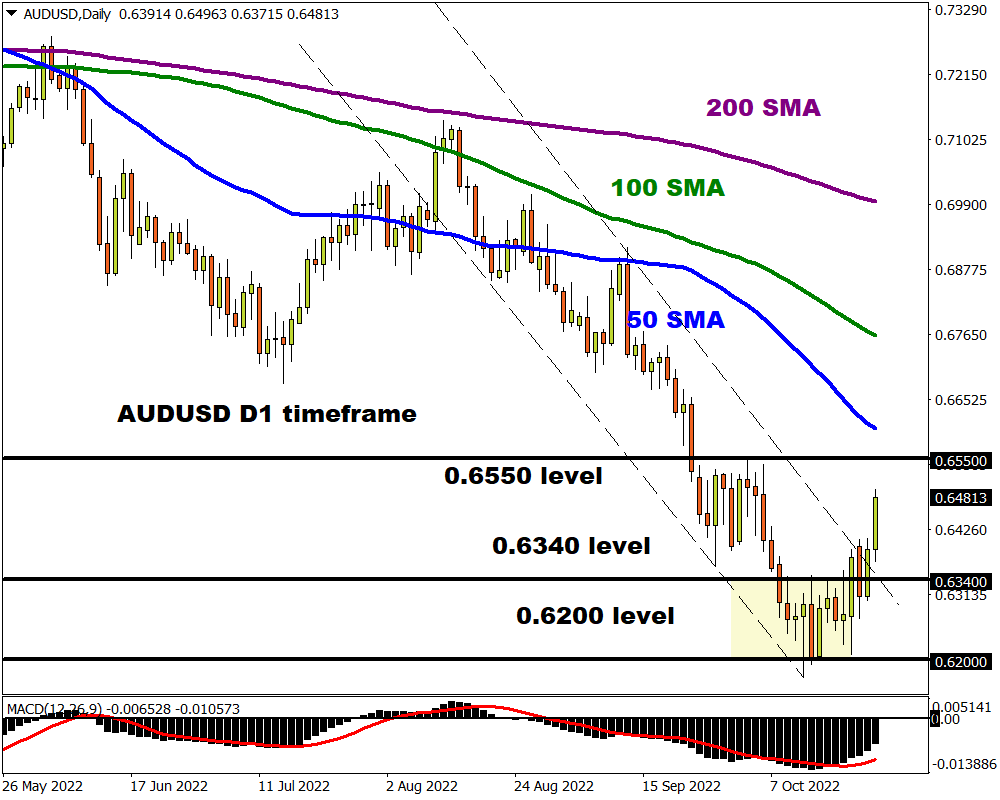 It looks like AUDUSD bulls are back in town. The sharp rebound witnessed today could signal the return of bulls with 0.6550 acting as a key point of interest. A strong break above this level could see the currency pair target the 50-day SMA and higher. Should 0.6550 prove to be a tough resistance to crack, the AUDUSD could return towards 0.6340 and 0.6200, respectively.