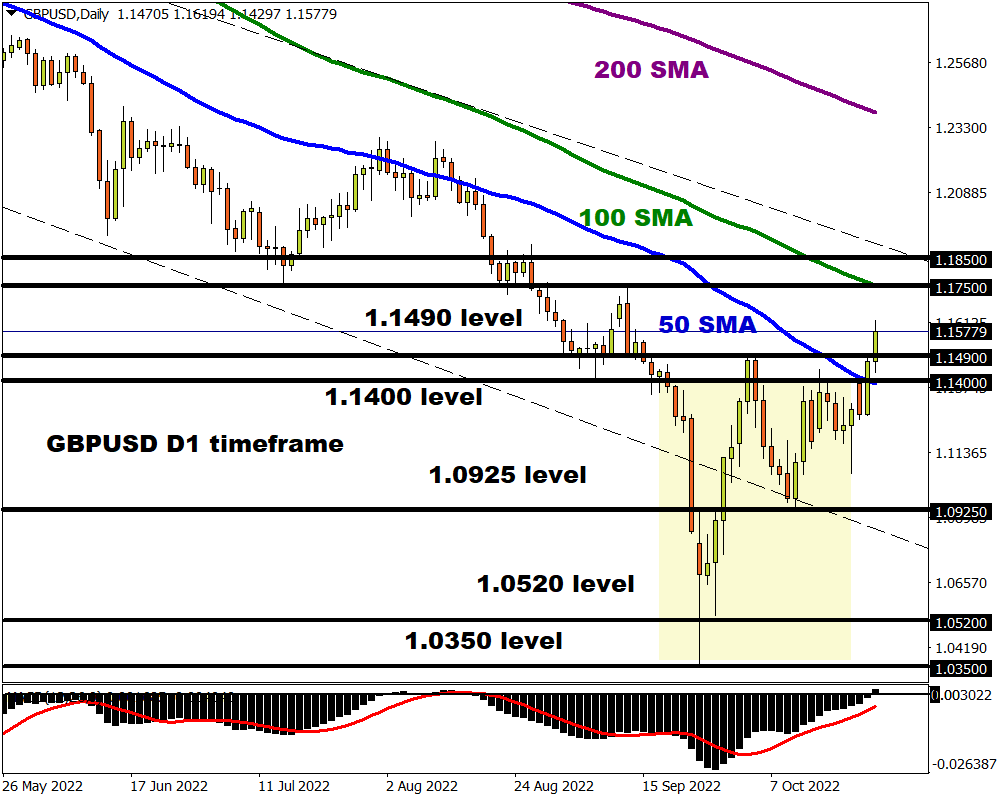 Pound bulls blasted above the 1.1490 resistance level this morning thanks to a weaker dollar. Prices have turned bullish on the daily timeframe and could hit the 100 SMA in the short term. A strong break above this level may see prices test the daily bullish channel around 1.1850. Should the upside lose momentum, a move back toward 1140 could be on the cards.