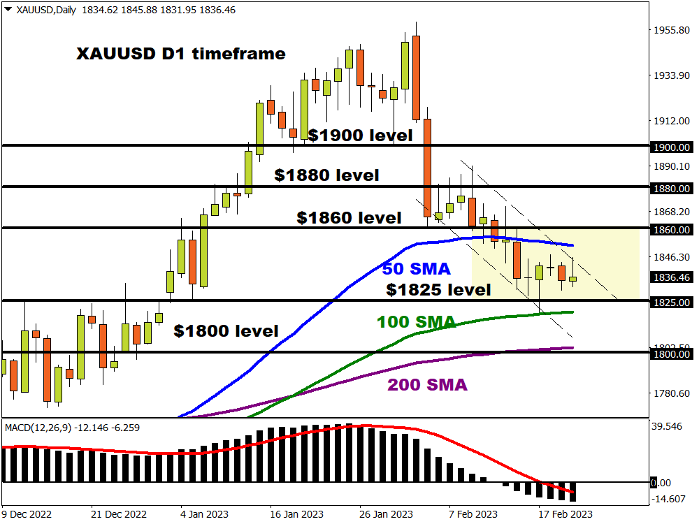 The path of least resistance for gold points south. Prices have been trending lower over the past few weeks despite the support at $1825. A strong breakdown below this level could open a path toward $1800. However, bears will need to fight support at not only the 100-day SMA but 200-day SMA. If prices can break back above the 50-day SMA, the next key level of interest can be found at $1860.