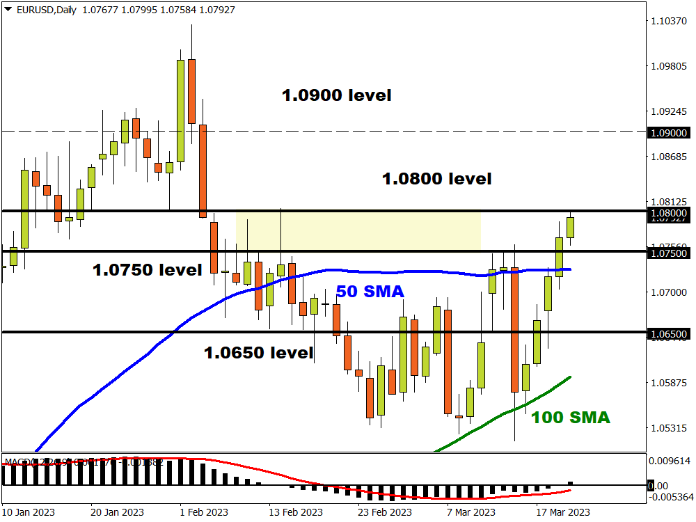 The EURUSD remains firmly bullish on the daily charts with prices touching the 1.0800 resistance. Bulls continue to draw strength from a weaker dollar with a breakout on the horizon. A solid daily close above the 1.0800 level could open the doors towards 1.0900. Should bears jump back into the scene, prices could sink back towards 1.0750.