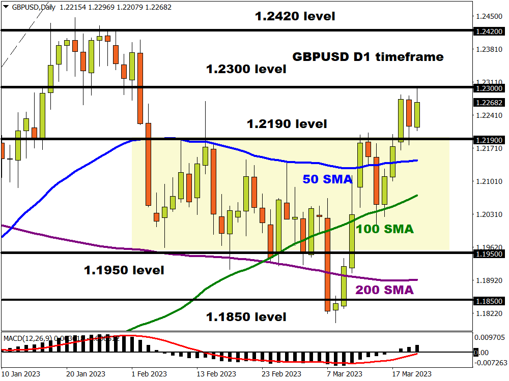 Pound bulls were injected with fresh inspiration after hot UK inflation figures fuelled expectations around the Bank of England hiking rates. Prices rose unexpectedly in the UK last month, rising 10.4% from January’s 10.1% thanks to the rising cost of food, clothing, restaurants, and hotels. The GBPUSD surged towards 1.2300 and could push higher if the dollar remains shaky ahead of the Fed meeting. A solid move above 1.2300 could signal an incline towards 1.2420.