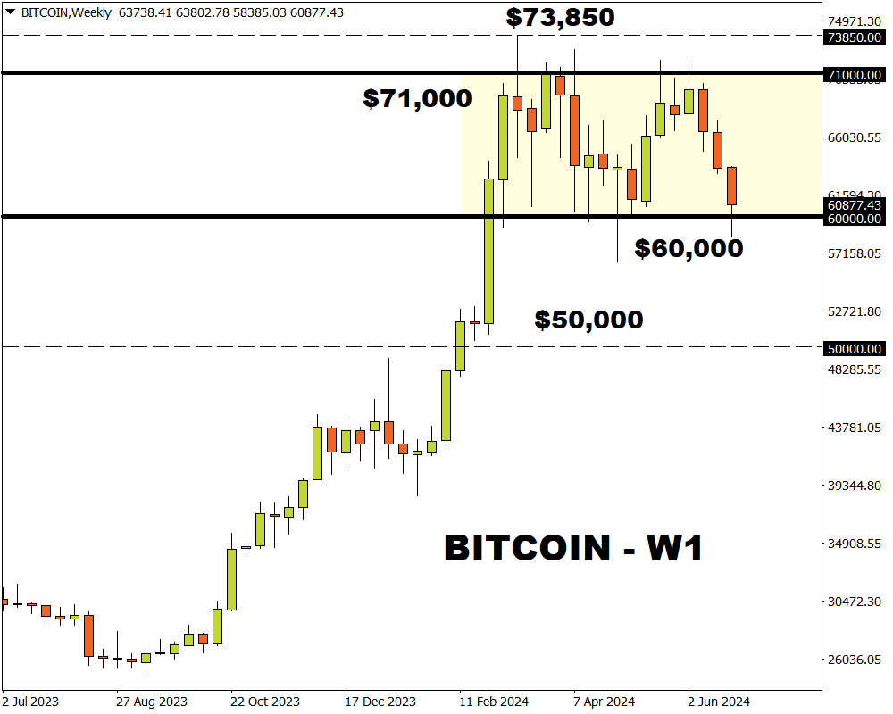 - Should $60,000 prove reliable support, prices may rebound towards $71,000 and the all-time high at $73,850.