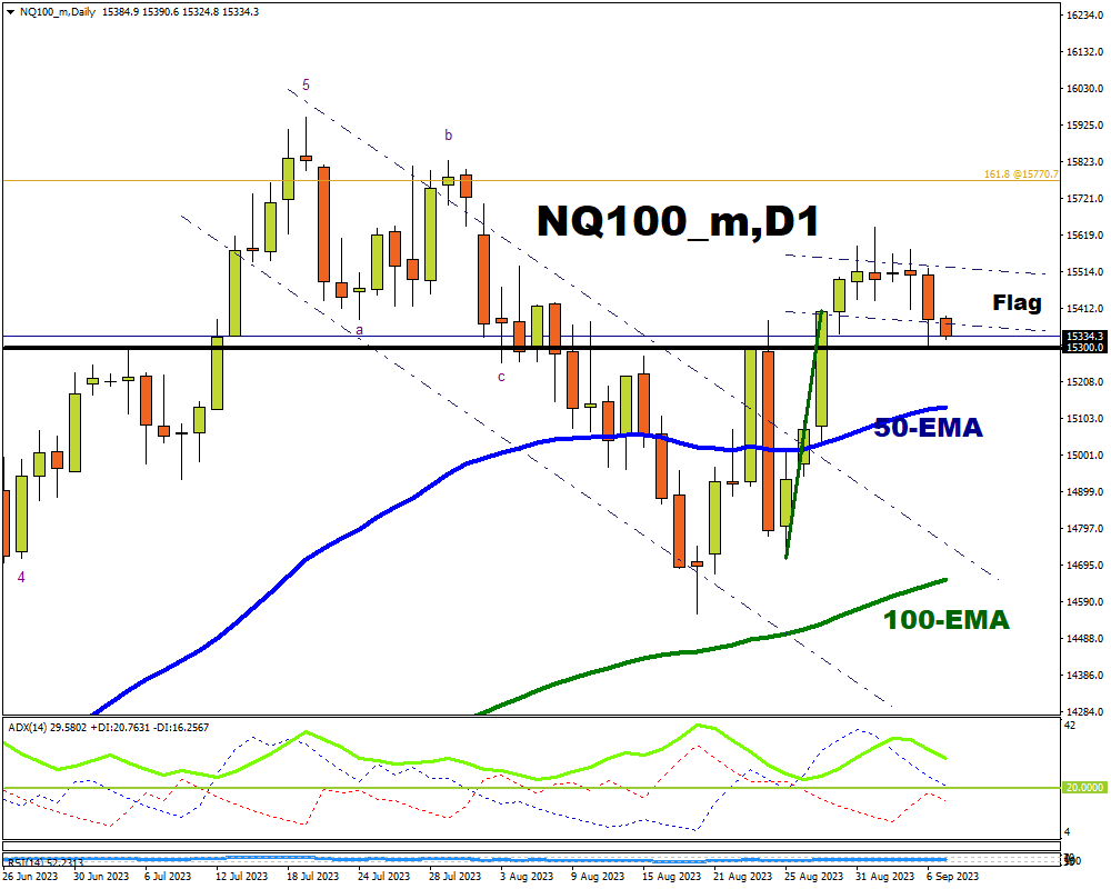 If we see a major rout in the tech stocks amid revived concerns over the Federal Reserve keeping interest rates higher for longer, then bears may be looking for a close outside of the flag and a strong close below the key 15300 price level for any signs of a continuous decline towards its 50-EMA.