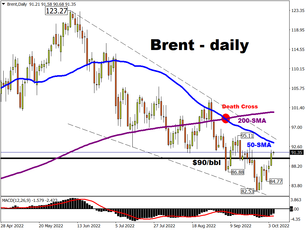 Brent is now in sentinel mode, hovering above the psychologically-important $90/bbl line at the time of writing, but still remains in the downtrend that's persisted since June.