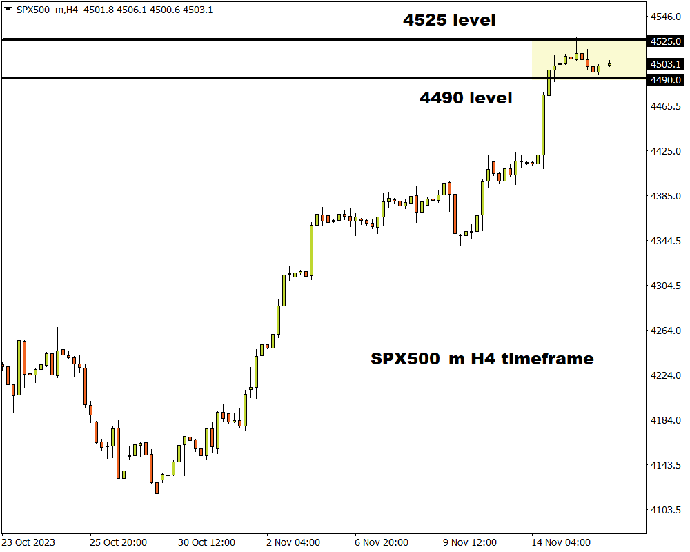 Looking at the daily timeframe, bulls have been on a roll over the past few days with the SPX500_m rallying over 7% since the start of November. However, bulls are currently eyeing a significant resistance level at 4525.
