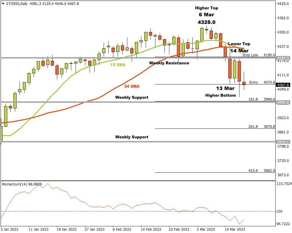 Given today’s environment, a larger-than-expected rate hike may fuel recession risks for the Eurozone while further damaging confidence about the health of the financial system. This would be bad news for European stock markets as the risk aversion, empowers equity bears – sending the STOX50 lower. It will be interesting to see whether the ECB mentions anything about the Credit Suisse situation. If the central bank strikes a confident tone and suggests that the Credit Suisse situation is temporary, this could boost investor confidence – ultimately supporting the STOX50.