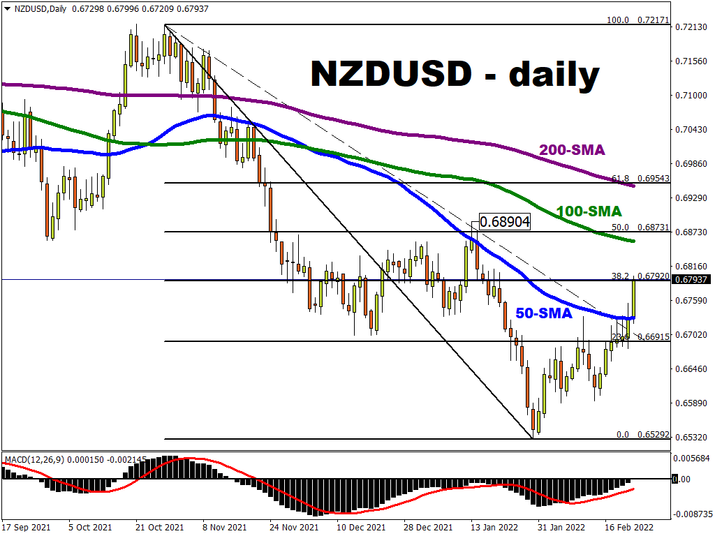 NZD/USD bottomed out at 0.6529 in late January and the kiwi has pushed above trendline resistance and the 50-day SMA around 0.6720/26 this week. Upside targets include 0.68 and the 100-day SMA at 0.6854. Support is the December low around 0.67 if external factors impact more heavily on risk sentiment.