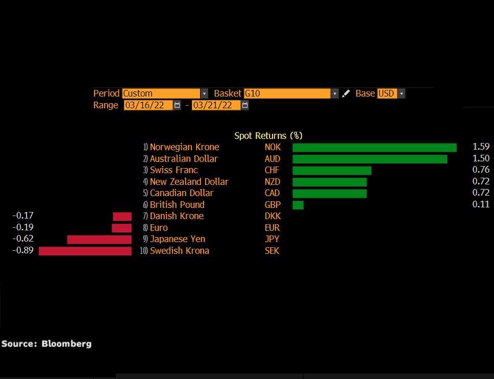 The mighty dollar’s failure to rally on a hawkish Federal Reserve and updated “dot plot” that signalled another 6 rate hikes in 2022 points to signs of exhaustion for bulls. Given how the latest war-related headlines failed to cushion downside losses, bears could be lurking and ready to pounce down the road.