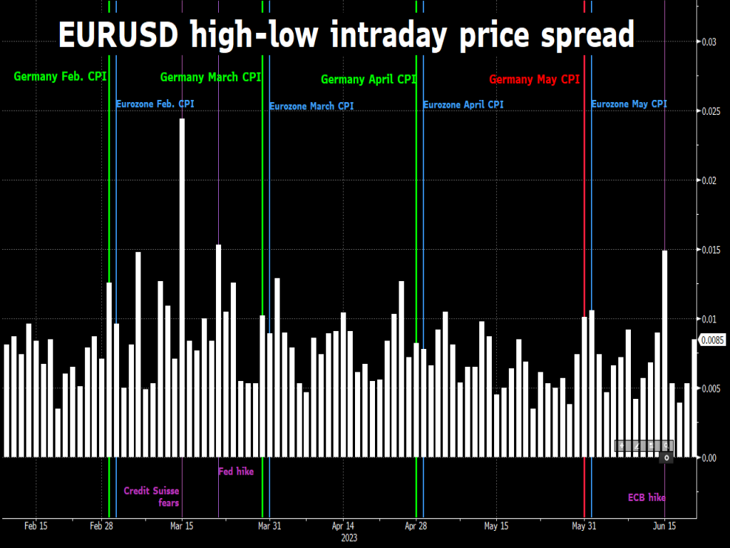 In other words, expect greater EURUSD volatility when Germany and the Eurozone release their respective CPI prints later this week.