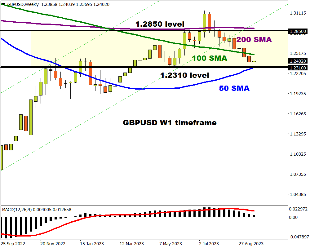 Buying sentiment towards the currency has also been hit by disappointing economic data, further supporting Governor Andrew Bailey’s comments about the BoE nearing the end of its hiking cycle. Taking a glance at the technicals, the GBPUSD is approaching weekly support at 1.2310 – where the 50-week SMA resides.