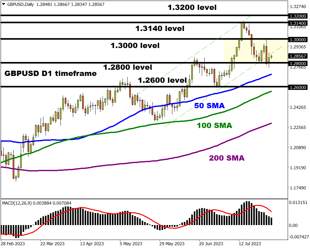 Over the past few weeks, buying sentiment toward the currency has been influenced by conflicting forces – placing bulls and bears in a fierce tug of war. Pound bulls continue to draw strength from rising expectations over the BoE keeping rates higher for longer in the face of sticky inflation. But bears remain supported by growing recession fears as UK economic data disappoints. Regarding the technical picture, the GBPUSD has found itself back within a wide range with support at 1.2800 and resistance at 1.3000.