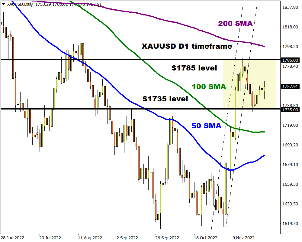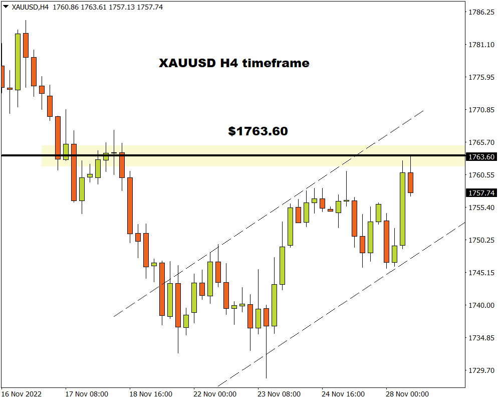Bulls have already made a move on Monday thanks to geopolitical tensions and this momentum could roll over into the next trading session. It may be worth keeping an eye on speeches by New York Fed President John Williams, and St. Louis Fed President James Bullard. There is a lot going on mid-week with Fed Chair Jerome Powell under the spotlight. He is expected to reinforce expectations over the central bank slowing its pace of interest rate increases from December. Such a development may lead to a weaker dollar and falling Treasury yields – resulting in a boost for gold prices. Investors will also be presented with the Fed Beige Book report and US 3Q GDP second estimate which could result in some additional dollar volatility, spilling over to gold.