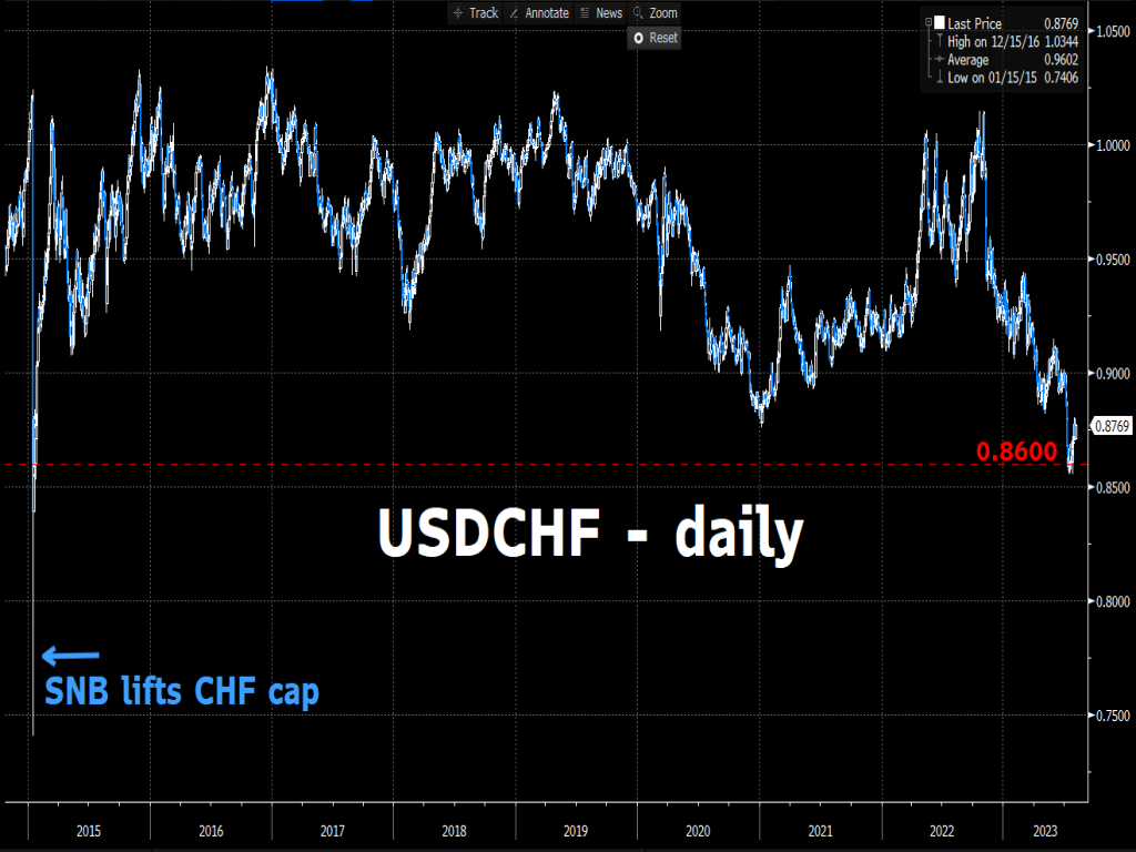 Back in mid-July 2023, USDCHF dipped below 0.8600 for the first time since 2015 - when the SNB lifted the Swiss Franc’s cap against the euro, which resulted in a skyrocketing CHF (and a plummeting USDCHF).