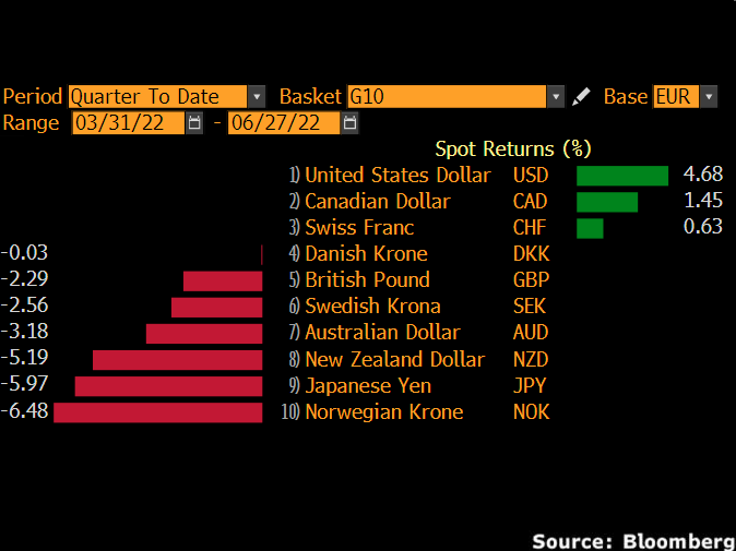 Before we sink our teeth into what to expect from the major events and EURUSD in the week ahead, it is worth keeping in mind that the euro has appreciated against most G10 currencies quarter-to-date. But against the mighty dollar, the currency is down roughly 4.7% due to the ECB lagging behind the Fed, which has moved aggressively to tame inflation.