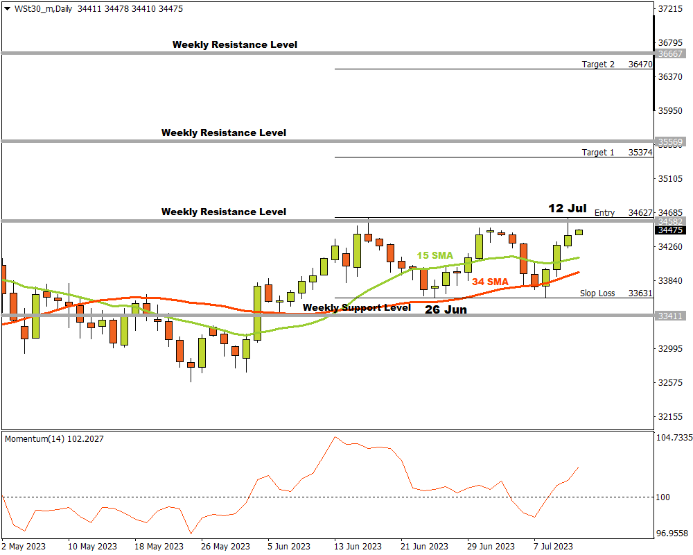 If the bulls can drive the price above the weekly resistance level and specifically a critical resistance that formed on 12 July at 34627, then two possible targets become possible from there.