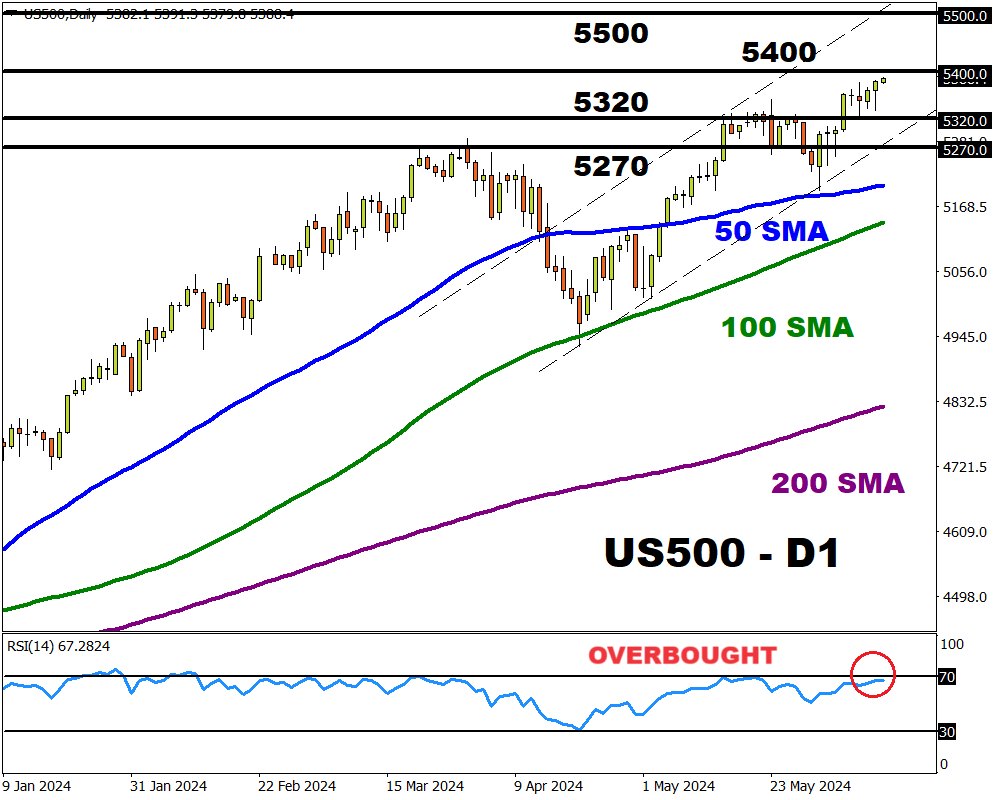 The US500 is firmly bullish on the daily charts with prices trading above the 50, 100, and 200-day SMA. However, the Relative Strength Index (RSI) is a whisker away from 70 – indicating that prices are overbought.