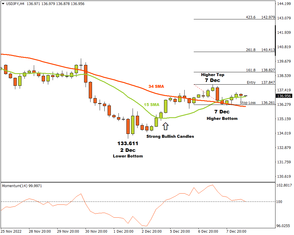 After the bottom at 133.611, the market broke through the 15 and 34 Simple Moving Averages and the Momentum Oscillator broke the 100 baseline into bullish terrain. A possible shift in the market momentum from bearish to bullish was further confirmed with many strong bullish candles driving the price significantly higher to make a higher top.