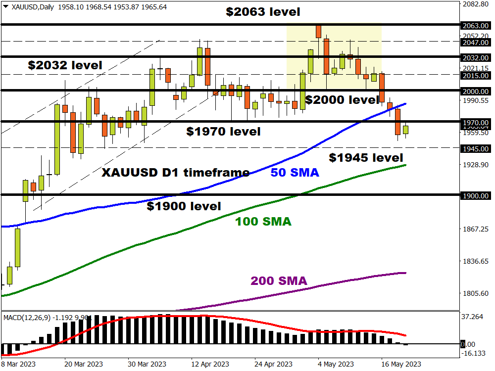 - Any hiccups in debt ceiling talks or further delays that shrink the window to strike a deal could send investors rushing back towards gold safe embrace. A wave of risk aversion and dollar weakness could push prices back above the psychological $2000 level.